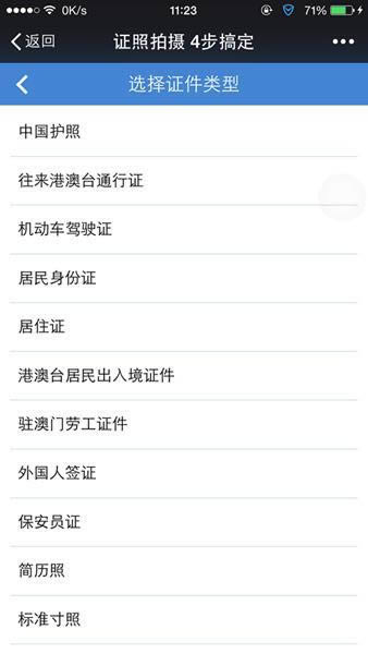 证照拍摄包括以下4个步骤:填写信息:填写办证机关所在地及证件类型(包括居民身份证、护照照片、机动车驾驶证、居住证等在内的12种证件照类型)。微信幸福照拍摄:若手机相册中有备份证件照,也可美颜上传。