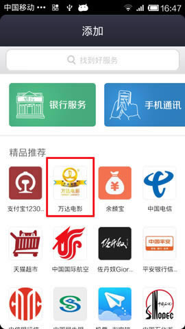 1)打开支付宝钱包软件,进入支付宝钱包后点击“添加”,然后在服务号里找到并点击“万达电影”。