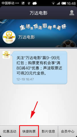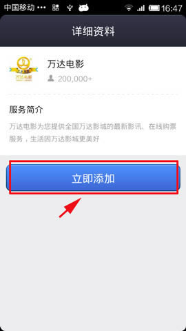 2)点击“立即添加”,然后进入万达电影的服务号,点击页面下方的“快捷购票”。
