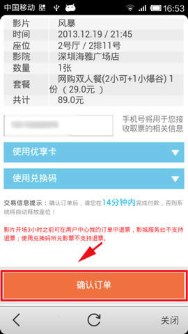 4)选择好座位后点击“立即购票”,还可以选择零食哦,选择好后点击“确认订单”,最后支付方式选择支付宝,输入你的支付宝钱包密码,那么电影票就购买成功了。