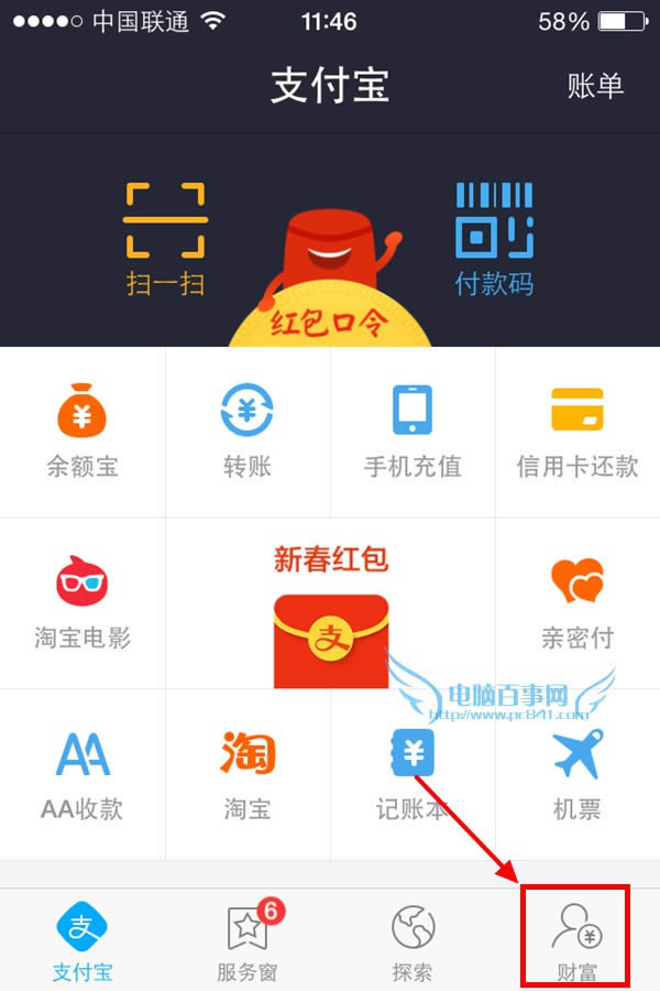 一、首先打开支付宝钱包,进入到支付宝钱包主界面,在其界面下方找到“财富”按钮图标,如下图所示: