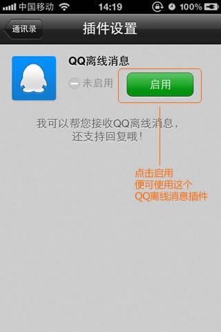 1、第一次使用时,必须先启用QQ离线消息这个插件,在微信通讯录里,找到QQ离线消息这个联系人,进到它的详细资料界面,点击头像旁边的启用按钮。