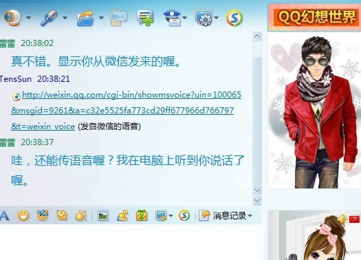 1、对方在QQ聊天窗口看到好友从微信里回复过来的内容,消息可以是文字,也可以是语音。