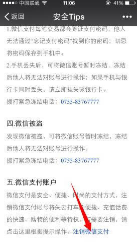 4、进入安全TIPS以后,我们将页面划到最下方,也就是第五项微信支付账户,可以看到最后方会显示注销微信支付,请点击!