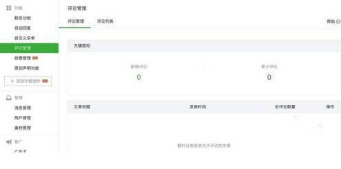 2、在公众号左上方的功能栏下点击“评论管理”以后,可以管理当前收到的评论。由于个人公众号才开通,目前还并未有评论。