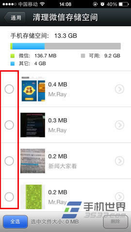 3)点击“清理微信存储空间”按钮进去,大家可以全选进行删除,或者进行单一的勾选删除即可。(如下图所示)