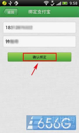 2)在进入功能界面,点击“绑定支付”宝按键,在进入绑定支付宝界面,输入支付宝账号和名字,再按“确定绑定”按键。(如下图所示)