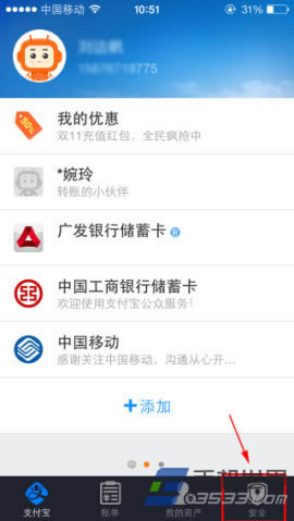 1)打开支付宝钱包,进入软件界面后点击“安全”。(如下图所示)