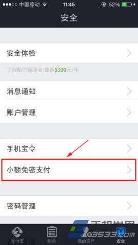 2)在“安全”界面点击“小额免密支付”,然后在“小额免密支付”界面里对小额免密支付按钮向右滑动。(如下图所示)