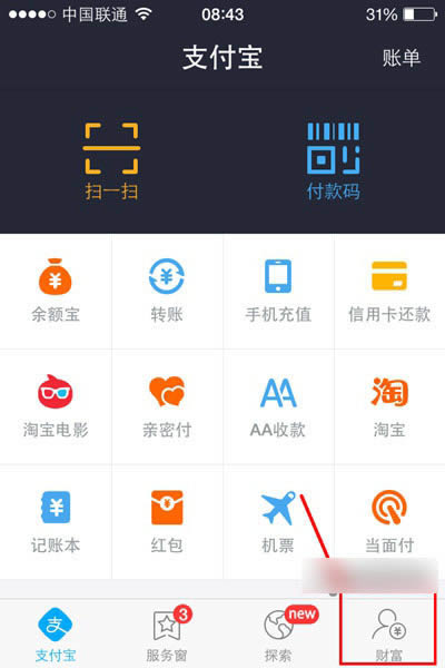 1,打开支付宝钱包,在其主界面切换到“财富”按钮页面,如下图所示: