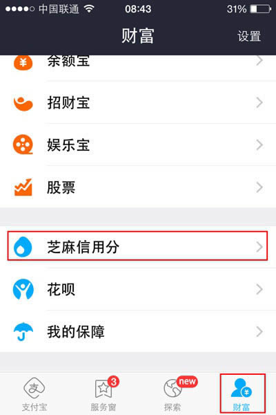 2,然后在财富页面下方找到“芝麻信用分”,点击进入,如下图所示: