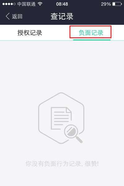 5,最后在查纪录页面会有两个记录可以查看,分别是授权记录和负面记录,点击一下“负面记录”便可看到自己的不诚信行为交易,如下图所示: