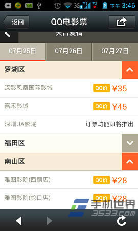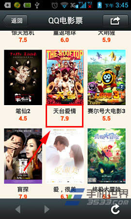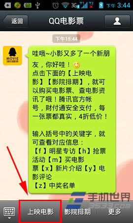 2)打开与QQ电影票的会话界面,然后在界面底部点击“上映电影”按钮。在打开的电影列表中选择自己喜欢的电影(如天台爱情)进行电影票地购买操作,如图所示。