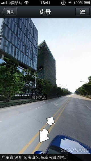 街景扫描脱胎于SOSO街景,并结合了手机重力感应及陀螺仪感应器,打开就可以看到身处地周边的街景,街景随手机方位改变实时变化,如果你玩过google sky map,那么你马上就能上手。这个功能对于出门旅游尤为实用,真正的边走边看。