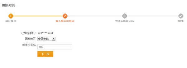 下面我们以支付宝更换手机号码为例,点击“更换号码”,在接下来的界面中,要求输入新手机号,然后点击下一步,如下图所示: