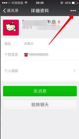 2、通过通讯录点击微信好友时,我们进入的便是他们的详细资料,大家直接点击右上角的菜单键进入;