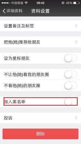 5、上面四步是删除微信好友的最有效办法,只是删除以后,对方仍会有你的微信号,那么该如何彻底删除微信好友呢?大家可以看到在点击好友菜单键里,会有加入黑名单的选项;