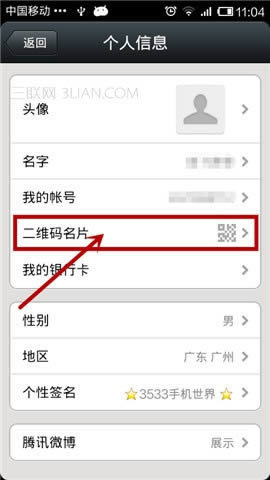 2)个人信息界面可以看到【二维码名片】。进入二维码名片设置界面,可以看到我的二维码图片,那么如何换一个二维码名片呢?点击二维码界面右上角【三点】按键(如下图所示)。