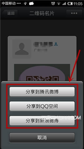 4)点【分享我的二维码】,弹出对界面便可看到分享到腾讯微博,QQ空间,新浪微博。也可以保存二维码到手机中。