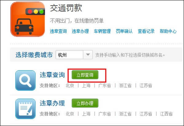 2、点击违章查询右侧的【立即查询】;