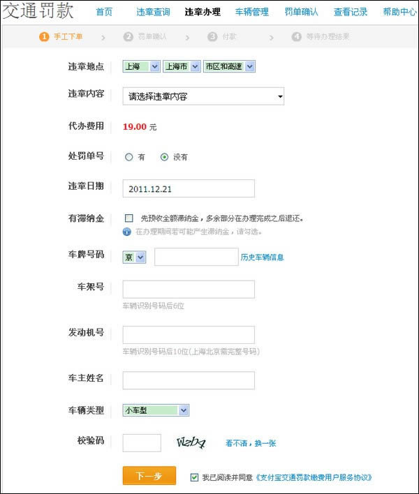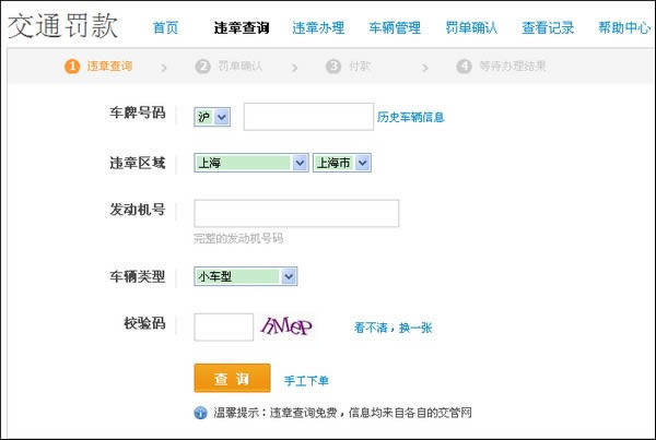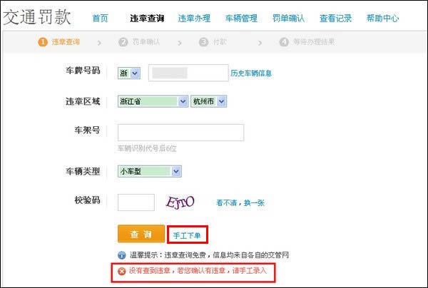 3)如您无违章记录或查询不到违章记录,页面下方提示“没有查到违章,若您确认有违章,请手工录入”,如您确认有违章记录可点击【手工下单】进入手工下单页面。