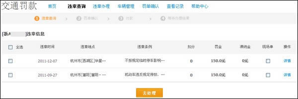 1)选择可以交款的违章记录,点击【去处理】;