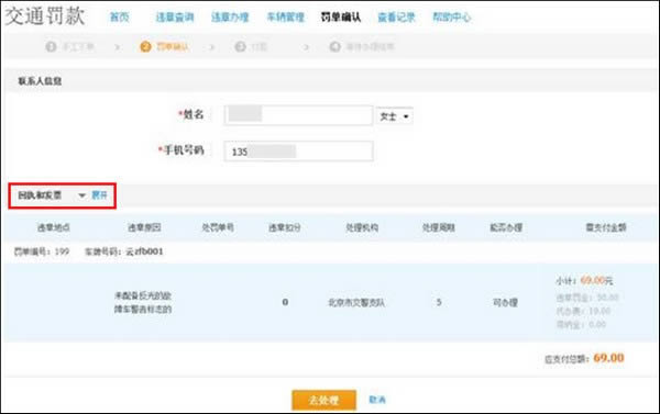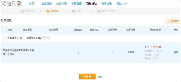 温馨提示:1)您可以点击【添加罚单】增加需一次性缴纳的罚单,或点击【删除】去掉不缴纳的罚单;