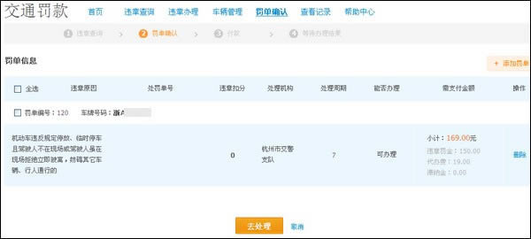 3、罚单信息确认,点击【去处理】;