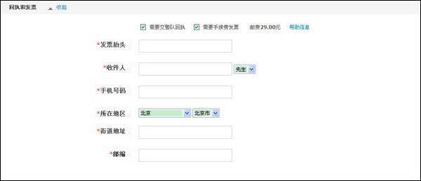 勾选是否需要回执和手续费发票,填写邮寄地址等信息(邮费29元);