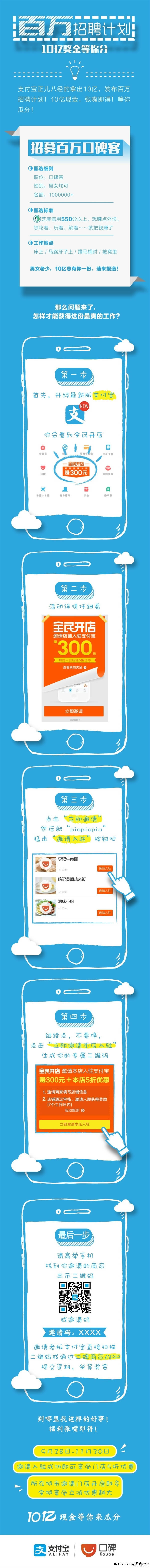 最近支付宝宣布将投资10亿奖金开启支付宝“百万招聘”计划,这项计划将在北京、上海、广州、深圳、杭州等全国123个城市开启,普通用户只要芝麻分达到550分以上就可以参与这个活动。用户需要通过支付宝钱包中的全民开店邀请商家在口碑开店就能获得300元的现金奖励,最主要的是这个是没上限的,只要你的口才好可以在业余时间邀请商家开店就算是额外收入了!