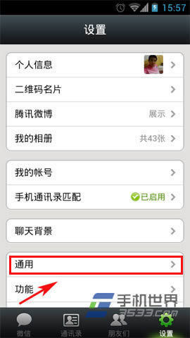 1)首页,打开“微信”,进入微信后点击设置按钮,然后点击“通用”。(如下图所示)