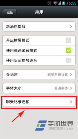 2)在“通用”菜单界面大家就能看到微信“聊天记录迁移”功能了。点击“聊天记录迁移”进入,里面有“上传及下载”2个功能按钮,现在先给大家讲解一下如何上传。(如下图所示)