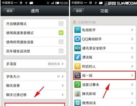 2、然后在点击“功能”,“摇一摇”就出现在已启用的功能栏里了,点击“摇一摇”。
