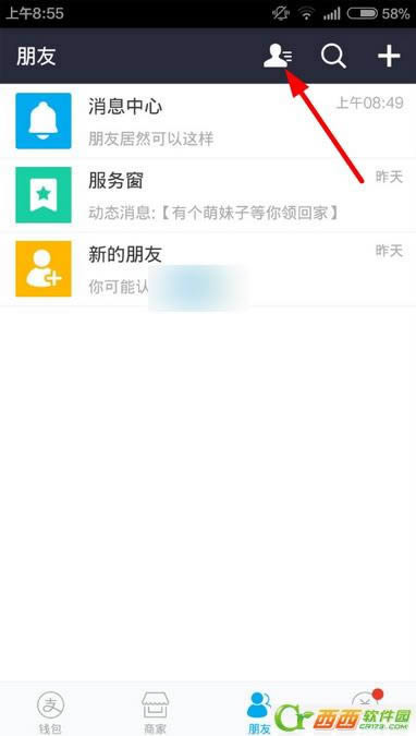 2、接着,点击首页下方的“朋友”,进入到朋友页面,并选择想要收款的对象。