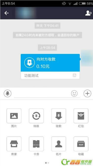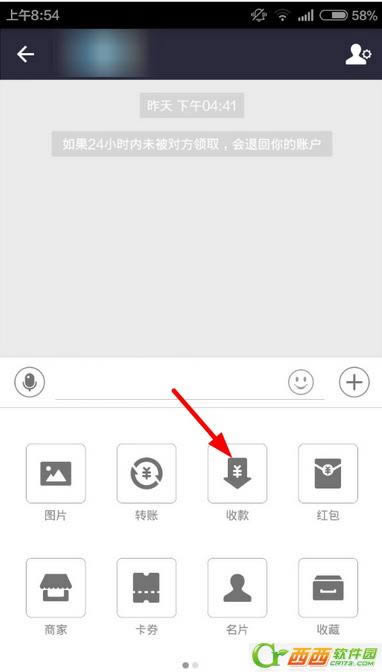 3、然后,打开该联系人对话窗口,点击“收款”。