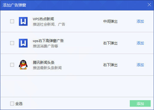 弹出【添加广告弹窗】全选打勾并添加即可。如下图所示: