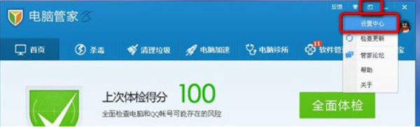 首先打开“QQ电脑管家”,点击右上角的“主菜单”,选择“设置中心”,