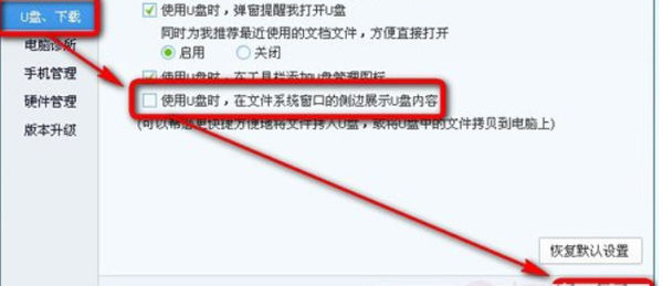 将“U盘防火墙设置”中“使用U盘时,在文件系统窗口的侧边展示U盘内容”前面的“√”取消掉。