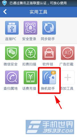 1)打开手机管家软件,在软件界面点击右上方的“图标”,在“实用工具”界面点击“换机助手”。