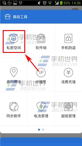 1)打开腾讯手机管家,点击下方【高级工具】,然后选择【私密空间】。(如下图)