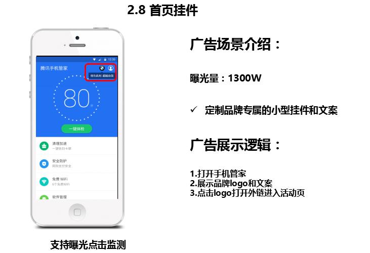 腾讯手机管家上的广告怎么收费投放?腾讯手机管家/wifi钥匙广告投放机制及展现形式说明。更多广告合作咨询广告部 +Q 739942137 电&联155-777 -49149 陈经理
