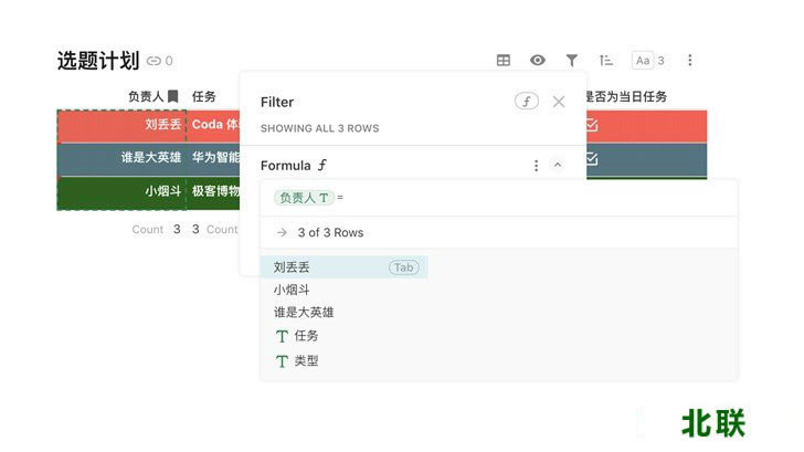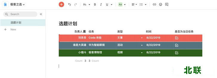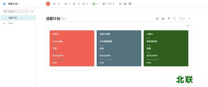 用具体例子来说明会更加直观。比如极客之选日常的选题计划:每个成员有当日的任务(用Text表现);任务类型是文章、视频拍摄、直播,或者日常运营(用Select表现);有截止日期(用Date表现)......每一个类型的项目都有相应格式去表现,利用这些功能可以构建一个丰富的表格。