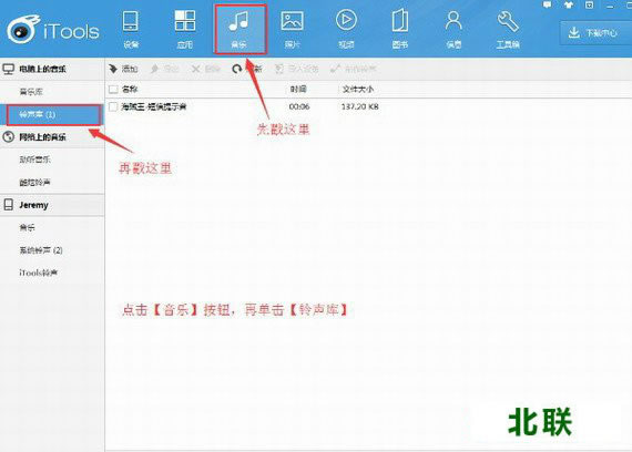 itools苹果助手功能介绍: 1、采用最符合用户使用习惯的操作界面。 2、提供了200多万款游戏和应用。 3、提供了手机壁纸和手机铃声下载。 4、提供了一键搬家功能,将旧手机的数据转移到新手机上。 5、能够将视频文件转换成适合iphone设备使用的格式。 6、帮助用户轻松管理图片、文档、音乐等等。 7、软件提供了手机铃声diy功能。 8、软件支持一键备份/还原手机数据。 i tools苹果助手铃声导入步骤: 1.下载安装完毕,打开itools苹果助手界面,点击音乐栏目,选择铃声库。
