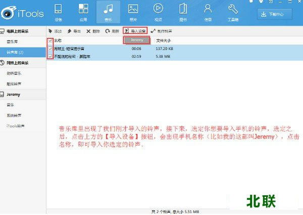 3.选择已导入的铃声文件,打钩即可,再点击导入设备,铃声就导入完毕。