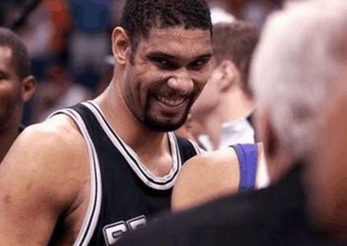 邓肯被人称作“石佛”,他的不苟言笑可是出了名的,人们都期待看到他笑。然而一次镜头却抓拍到邓肯这样的笑容,算了算了,邓肯你还是别笑了,吹你技犯是应该的!