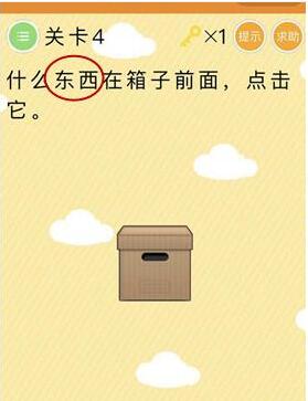 但是这个游戏并不是这么玩的,首先玩家要利用脑筋急转弯的思路去思考这个游戏,不要局限与整个图片上的东西,要考虑字面意思,什么东西在箱子前面。