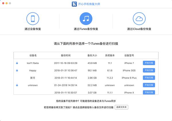开心手机恢复大师是一款电脑软件,可以兼容运行在常用台式机、笔记本等Windows电脑和苹果Mac电脑上。并且,开心手机恢复大师提供了特有的三大恢复模式,分别为:从设备扫描恢复,从iTunes备份文件恢复,从iCloud备份恢复。在数据恢复的过程中,建议三大恢复模式依次使用,这样可以更好的找回误删或者丢失的苹果设备数据,以及备份数据。