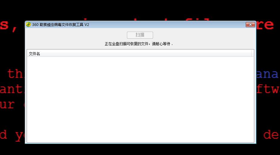 二、重启电脑后进行全盘扫描,彻底清除勒索病毒(杀毒并不会修改病毒留下的桌面壁纸,需要自行设置喜欢的壁纸)。然后在360安全卫士主界面点击“勒索病毒恢复”图标,打开“360 勒索蠕虫病毒文件恢复工具V2”,点击扫描按钮: