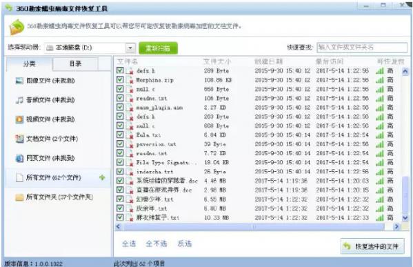 本工具的文件恢复成功率会受到文件数量、时间、磁盘操作情况等因素影响。一般来说,中毒后越早恢复,成功的几率越高。