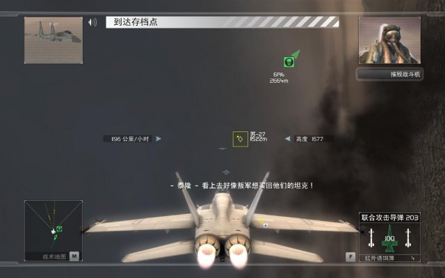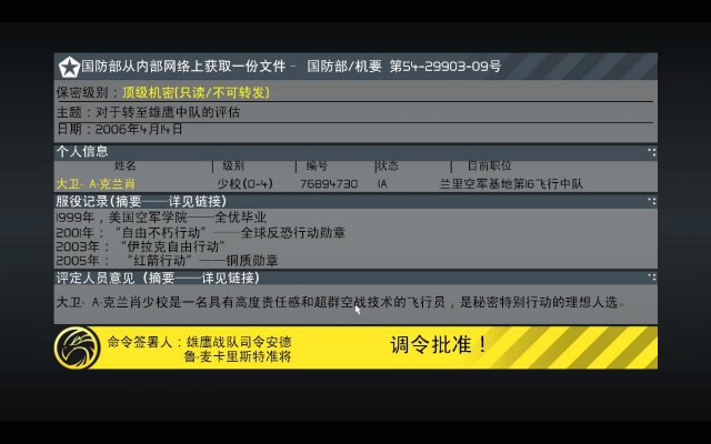 另附:《鹰击长空》官方简体中文汉化包(13MB 点击下载) 该汉化补丁只对DX10有效果,也就是W7以上版本的操作系统。XP使用后会看不到文字,请酌情下载。